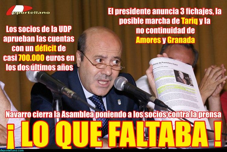 Ojala se cumpla todo lo bueno prometido y el club quede saneado antes del 31 de julio. Todos estaremos contentos y algunos seguirán siendo periodistas y presidentes de segunda B con aspiraciones a subir un poco más. A pesar de ello, no se puede cerrar los ojos ante una mala gestión económica y deportiva que ha llevado al club a esta situación a día de hoy. Nadie comprende como han podido pasar tres entrenadores y mucho menos por qué se despidió a uno que tenía al equipo quinto en la tabla y desplegando el mejor juego en años. La excusa: que no se hizo con el vestuario, “se reían de él, e incluso le mandaban a hacer puñetas por no decir cosas peores”, comentó Navarro.. Culpa del entrenador y no de los irrespetuosos jugadores. Casi nadie comprende tampoco como se han pagado casi 350000 euros más en sueldos que los presupuestados cuando se prometió en la anterior asamblea un recorte en las nóminas (se fueron buenos jugadores a los que se tuvo que indemnizar por esta causa). Tampoco se comprende como no se incluyeron en las partidas previstas algunos conceptos como el presupuesto del 60 aniversario o los intereses bancarios que se deberían conocer con anterioridad de forma muy aproximada.